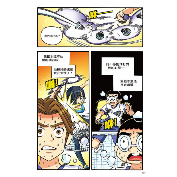 圖像式漫畫結合生動可愛的人物和勵志熱血的故事編排,加深小朋友對於運動知識的理解,激發小讀者對運動及羽球的興趣,並期許小讀者能和故事主角們一樣,秉持樂觀、積極的精神,堅持夢想!