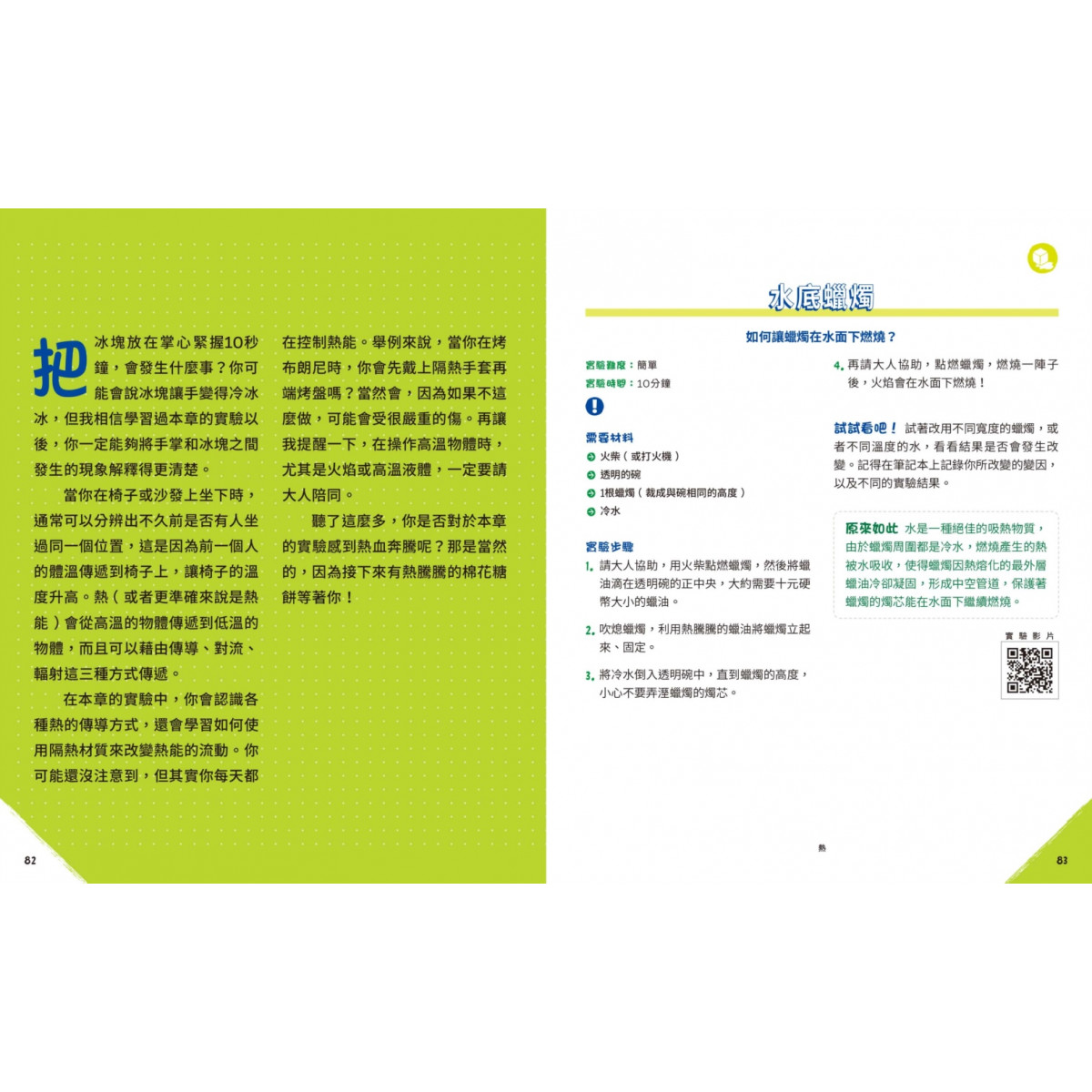 ● 熱:在本章的實驗中,你會認識各種熱的傳導方式,還會學習如何使用隔熱材質來改變熱能的流動。讓你「熱」血沸騰的進行實驗。