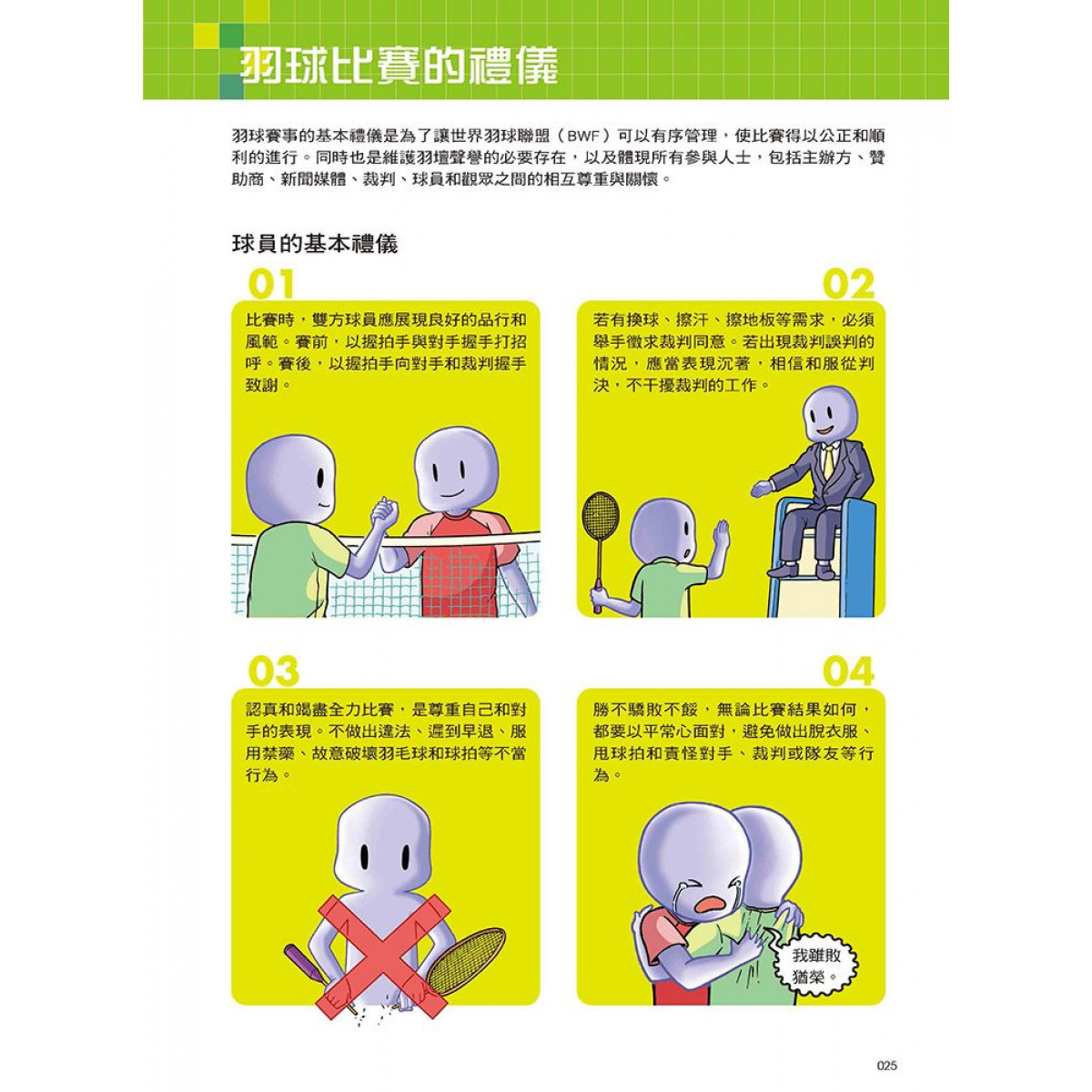 圖像式漫畫結合生動可愛的人物和勵志熱血的故事編排,加深小朋友對於運動知識的理解,激發小讀者對運動及羽球的興趣,並期許小讀者能和故事主角們一樣,秉持樂觀、積極的精神,堅持夢想!