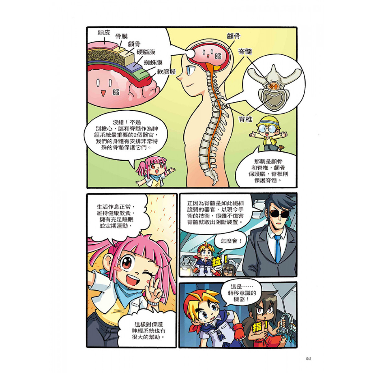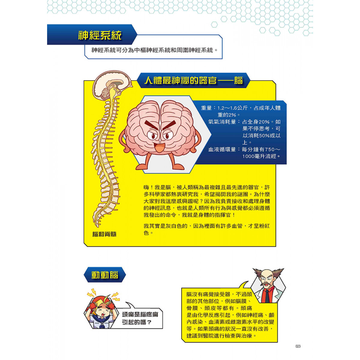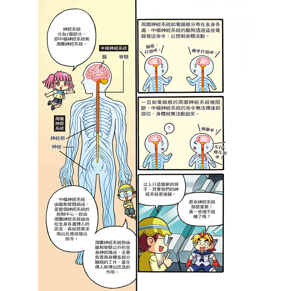 設有「人體小百科」單元,藉由X萬獸探險隊隊員的生動對話和淺顯易懂的文字,來介紹腦與脊髓的結構與作用、神經元傳遞訊息的方式、周圍神經系統的類型與作用、神經系統疾病的症狀與預防方式、神經內科與外科的區別等超炫常識,讓小朋友有系統的學習。