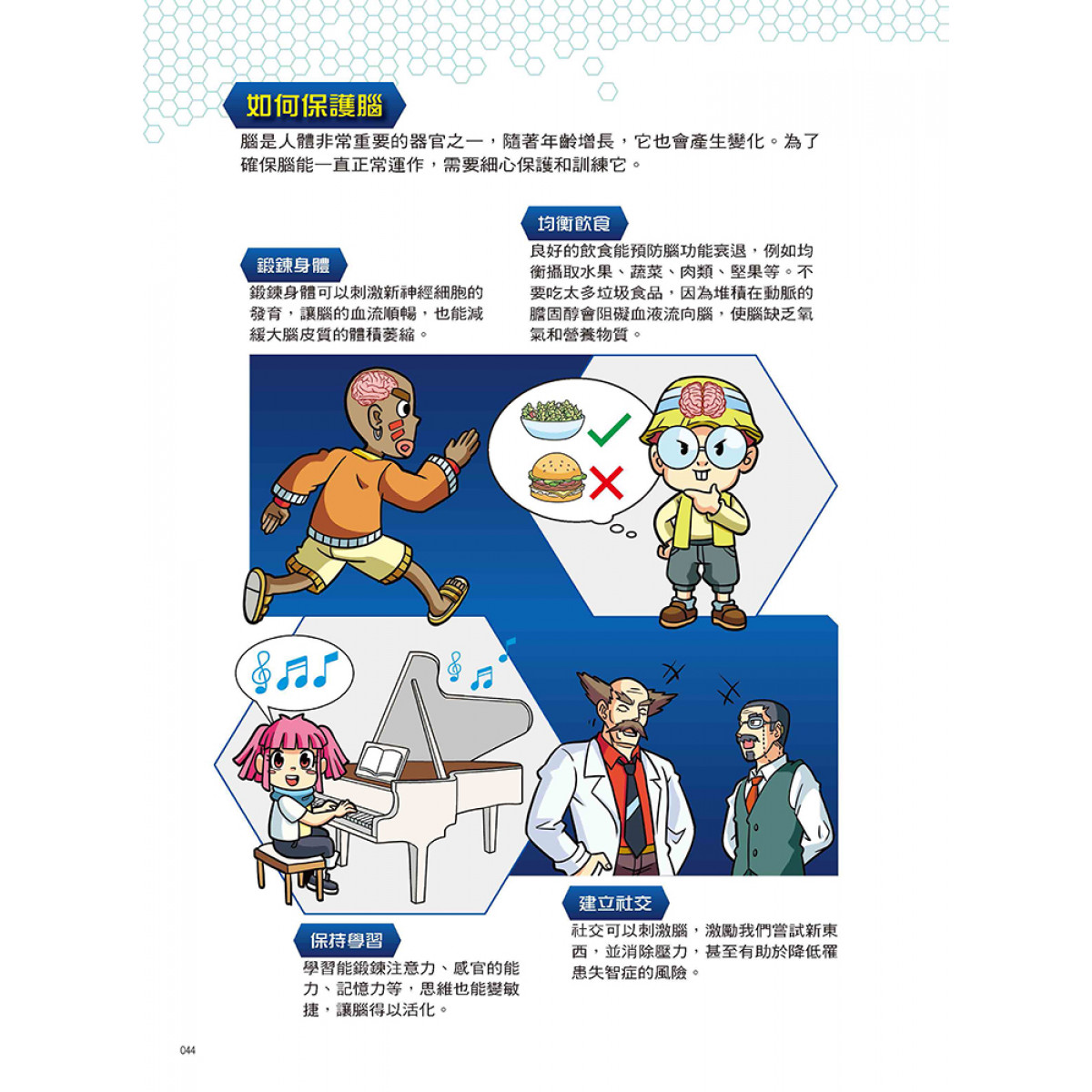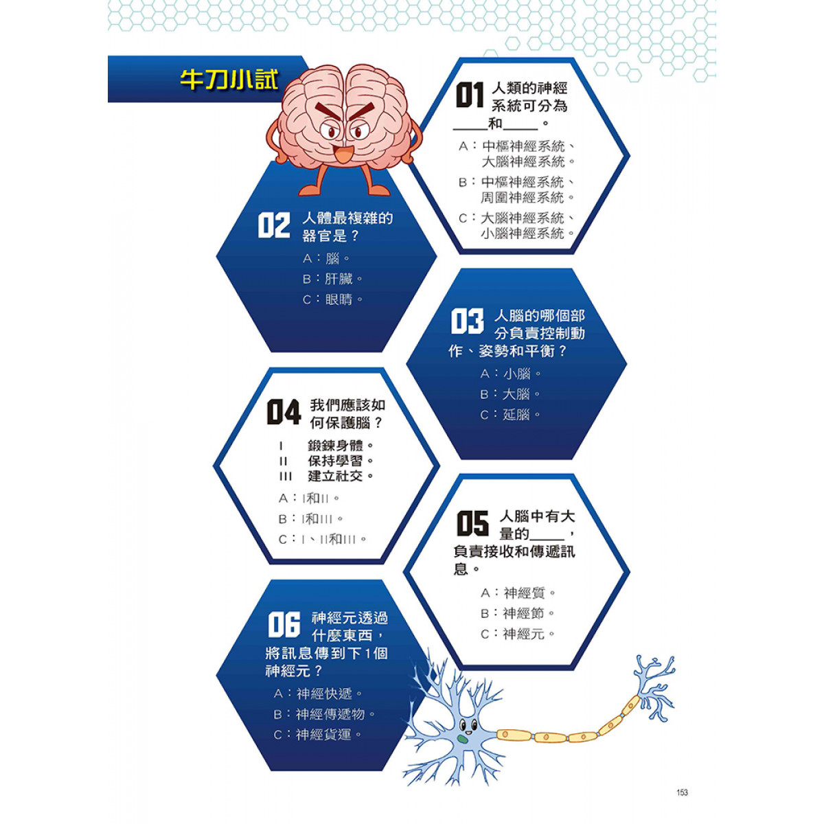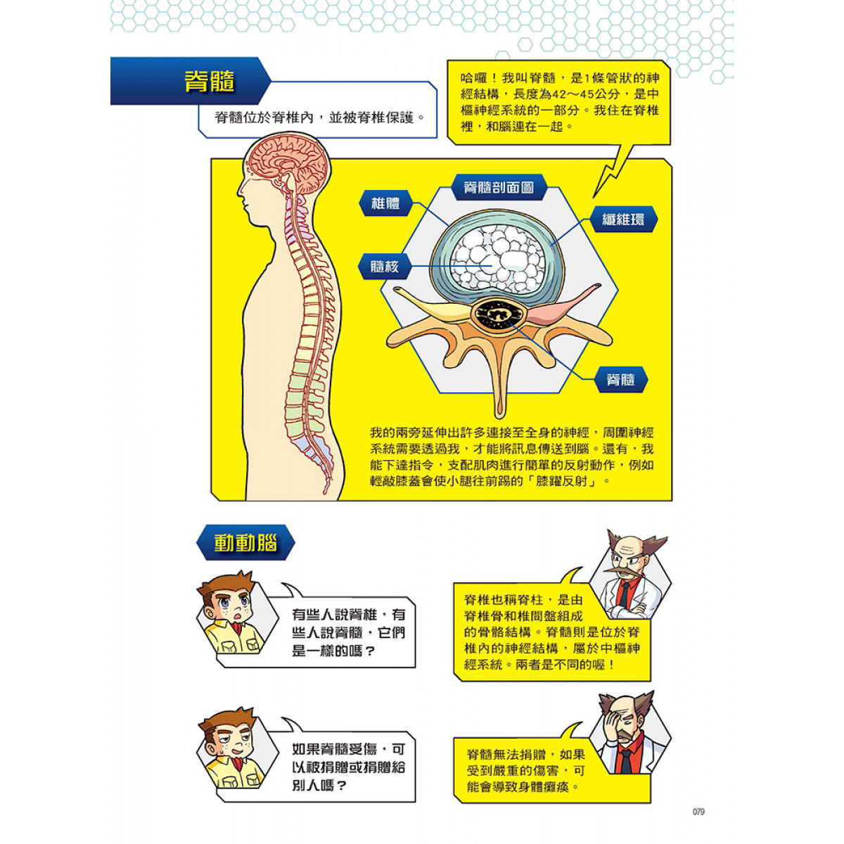 設有「人體小百科」單元,藉由X萬獸探險隊隊員的生動對話和淺顯易懂的文字,來介紹腦與脊髓的結構與作用、神經元傳遞訊息的方式、周圍神經系統的類型與作用、神經系統疾病的症狀與預防方式、神經內科與外科的區別等超炫常識,讓小朋友有系統的學習。
