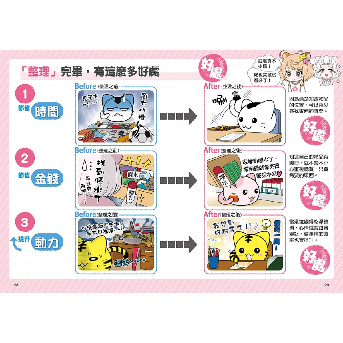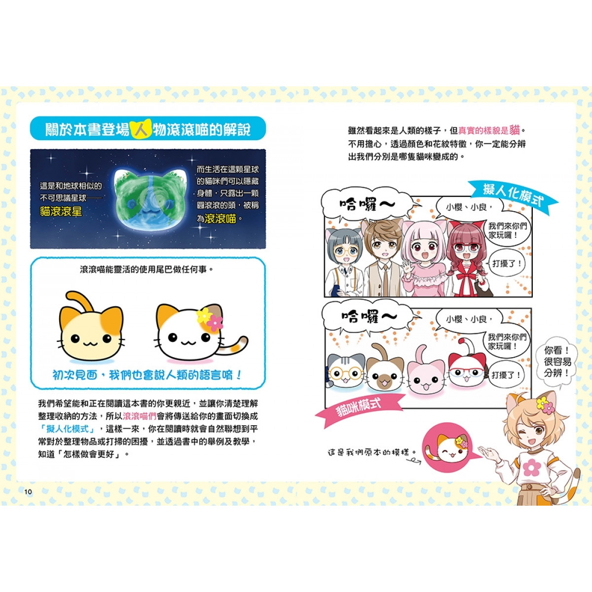 房間總是亂糟糟,經常找不到東西,每次整理完沒幾天又亂了!該怎麼做才能有效率的整理好物品呢?本書以「貓滾滾星球」的「滾滾喵們」為主角,並將他們擬人化,用生動漫畫呈現我們經常遇到的整理難題,再由整理收納專家「黃貓老師」針對問題提供各種解決法及良好的建議,讓你透過有效率的整理技巧,變得更愛打掃及保持清潔,每天都笑容滿滿!