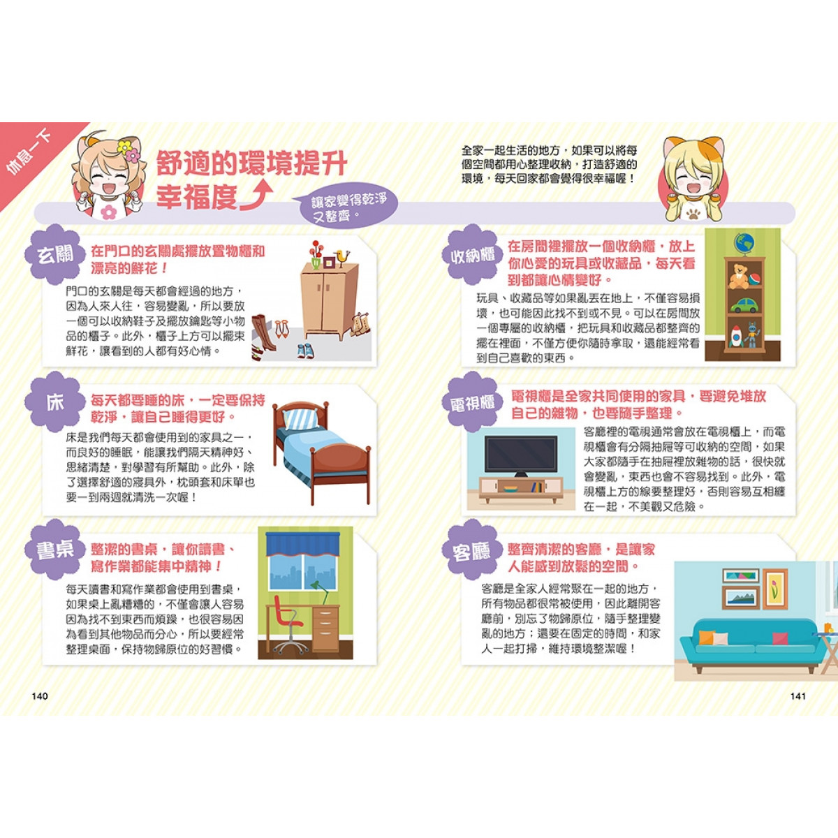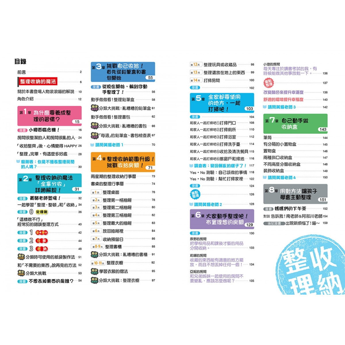 不論是家長或孩子,整理家中各處,一直都不是件輕鬆的事,但閱讀本書後,便能輕鬆理解整理和收納的訣竅,就是不斷重複「全拿分收」的動作,「全拿=全部拿出」、「分=分類」、「收=收納」,書中透過這個重點,教導孩子以小範圍的方式整理,讓書桌、書櫃、衣櫥,直到整個房間都變得乾淨整潔,同時學會各種打掃技巧。此外,客廳、浴室、廁所等與家人共用的地方,也能主動打掃及維持整潔,大家的生活都更舒適且愉快。