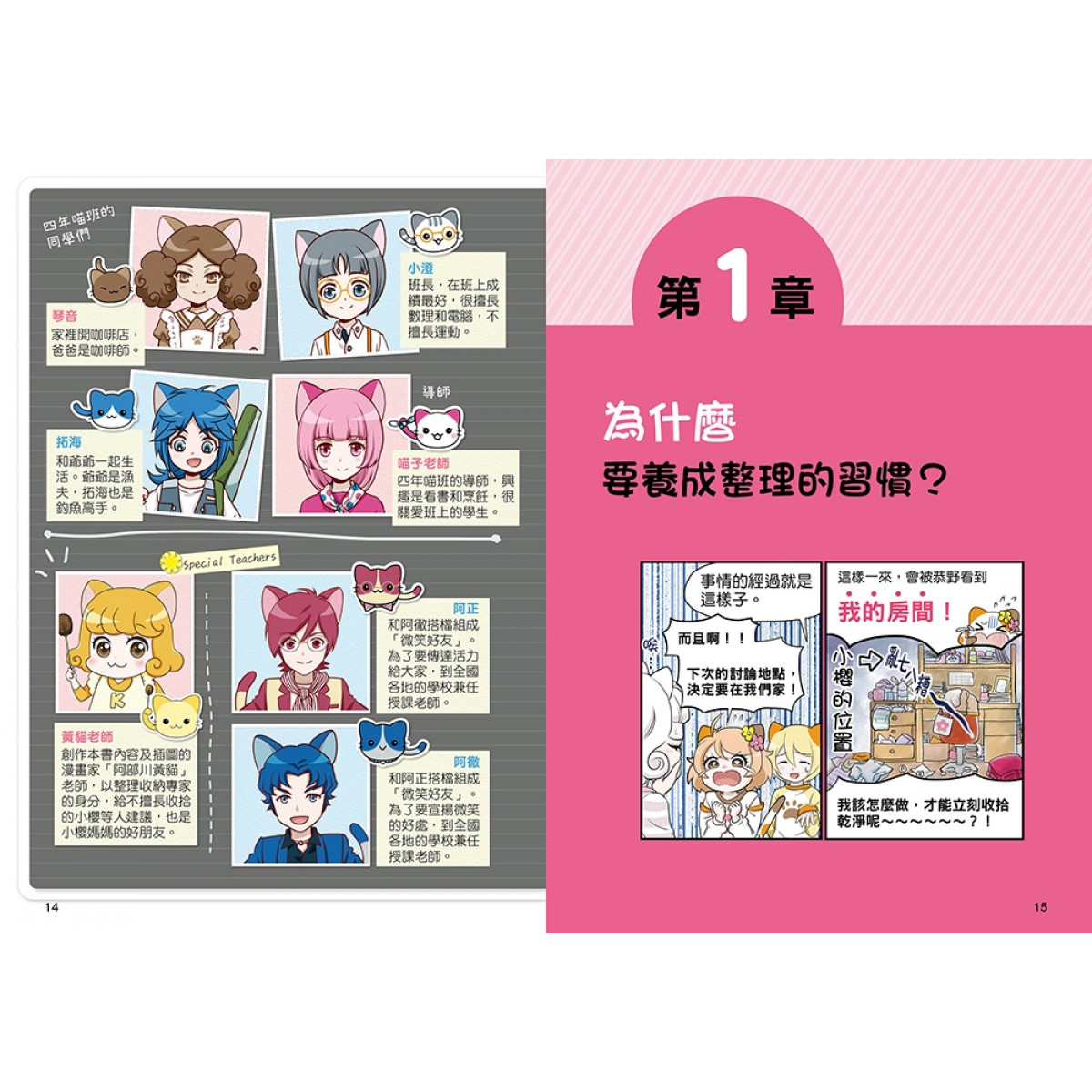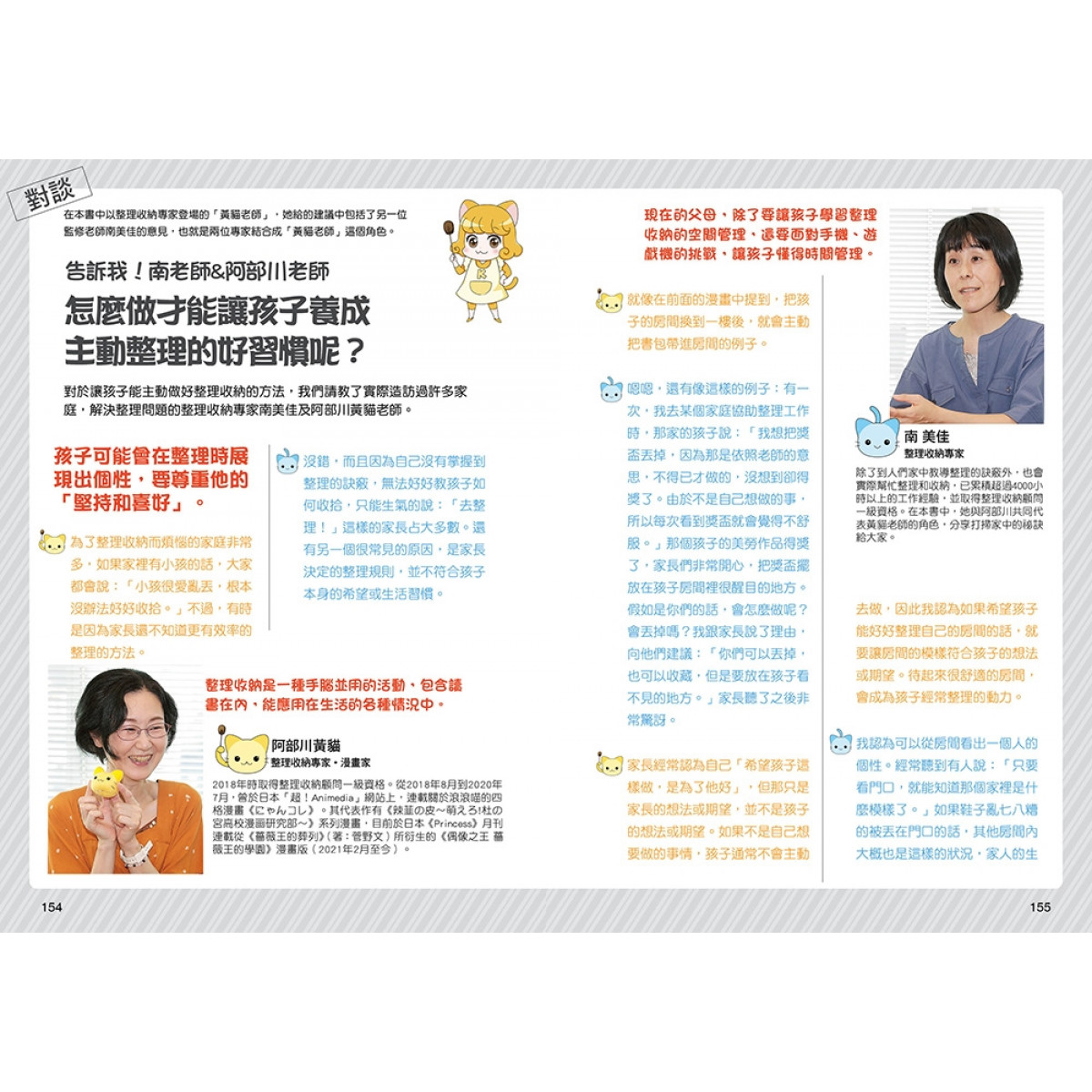 書中的黃貓老師是由實際存在的整理收納專家「南美佳」和「阿部川黃貓」共同擔任,她們透過自身的經驗,詳細描述整理及收納的方法,並提醒大家要養成物歸原位、分類、隨手清潔等良好習慣,才能持之以恆,讓環境不再變亂。此外,書末特別收錄兩位專家想給家長閱讀的訪談,家長可透過內容了解該怎麼做才能讓孩子對於整理這件事不再排斥,而是會主動收拾,除了同時解決家長及孩子對於做家事的煩惱,也讓家人間更互相理解及融洽。