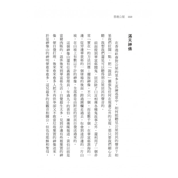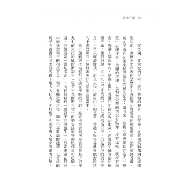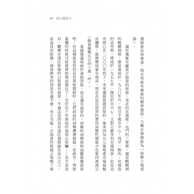 「這本書以公屋為題,但寫著寫著,我逐漸發現我要談的不只是公屋:印象被定形、生活被規範、需求被馴服、聲音被代言……這些事情,當然不只在屋邨發生。在屋邨中,政府在生活的位置相對明顯,規限和挑戰因而相對直接;但同樣的困難,可不限於屋邨,甚至不限於香港……走遍全港大小屋邨之後,我得到的最大感應,大概就是黃偉文筆下那位少年的躁動:說話很難,但還是要想辦法說話。