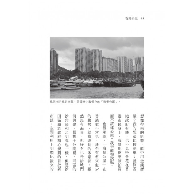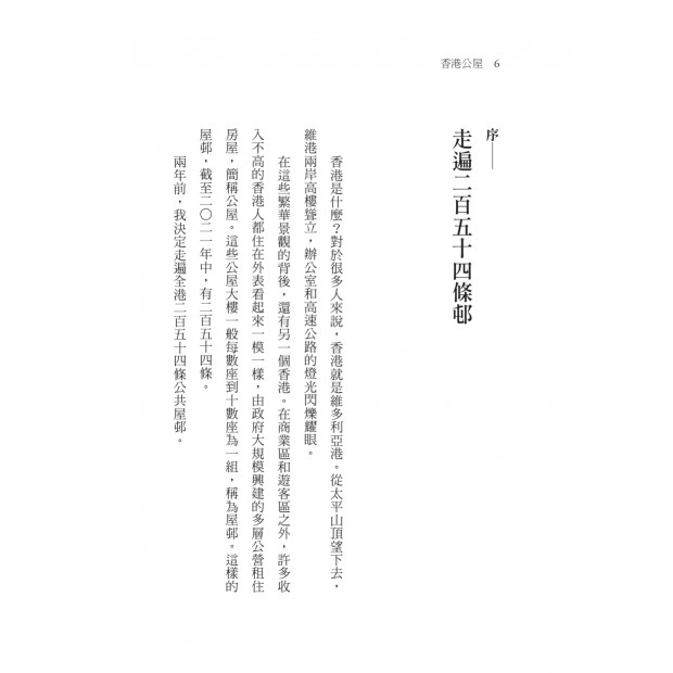 土地是香港最稀缺的資源,以此而生的住房問題一直是收入不高的人們與政府的沉重壓力。只要凝視著任一張香港公屋的照片,很難不感受到衝擊:這麼多家戶、這麼多種人生、這麼多的人,被框在一個又一個小小的方格子裡;數量龐大的方格子在窄仄的土地上堆疊成高聳的大樓,多棟大樓再組成屋邨……截至二〇二三年八月,香港有二百五十九條公共屋邨,是近三分之一香港人的生活空間;而等候住進公屋的申請案超過二十三萬件,平均要等五‧三年才有機會「上樓」——住進公屋。