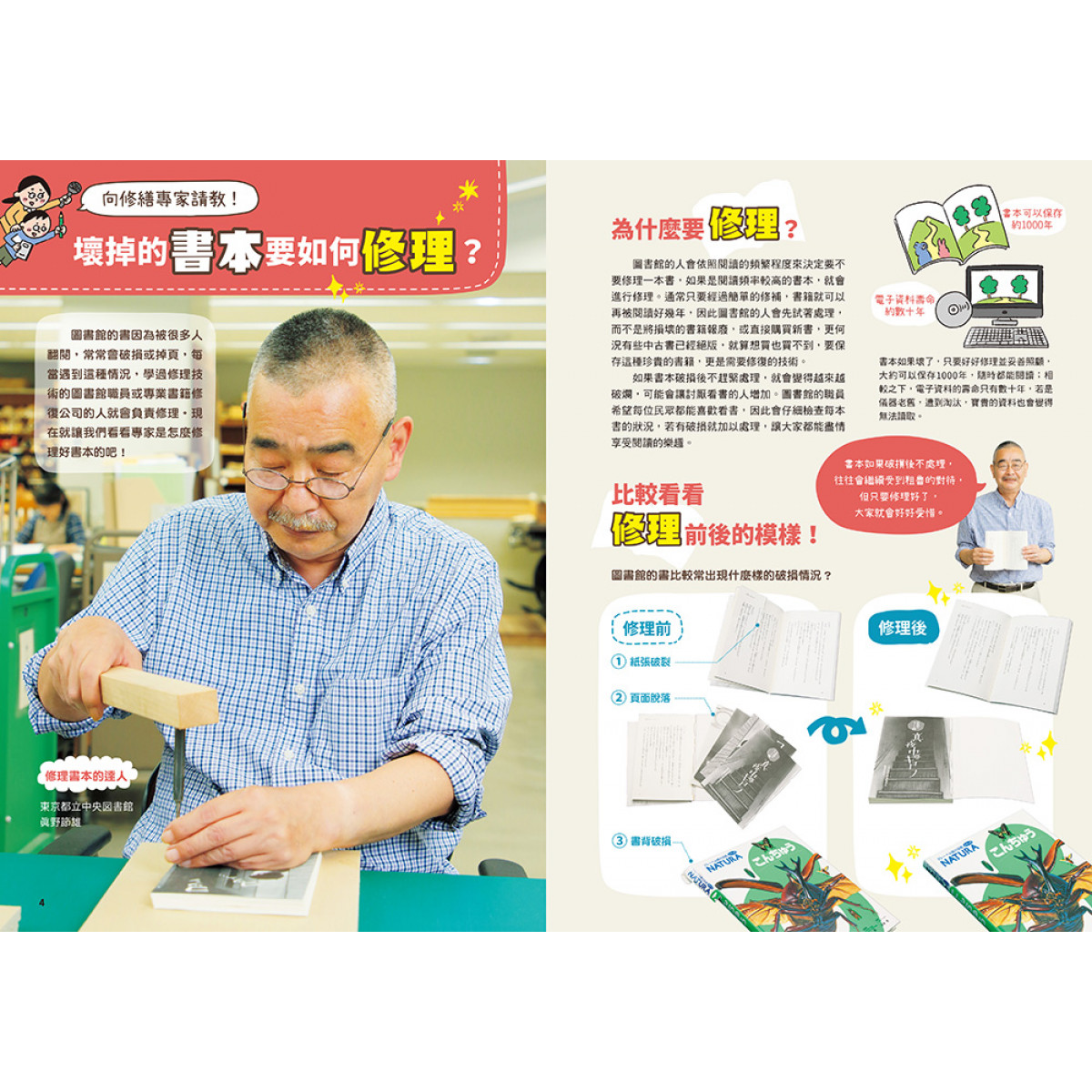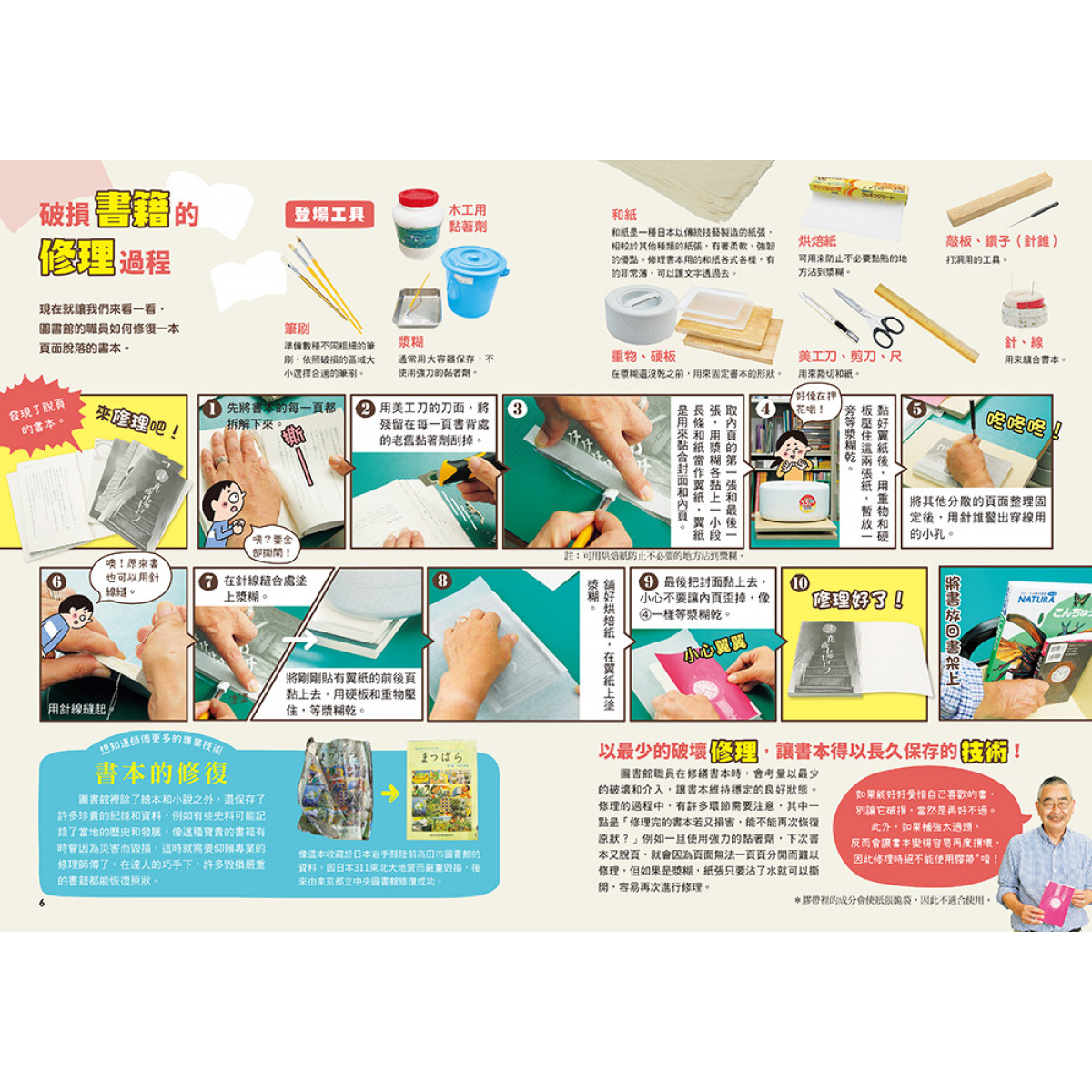 由於喜愛、經常翻閱的關係,小朋友的讀物經常會有些損傷,此時若有一套書籍可以習得如何簡單的修復,從隨手可得的工具與材料、書本的結構詳盡介紹,透過實作修復,不但愛書能重獲新生,同時也得到手作的樂趣與滿足感。物品的珍愛之心需從小培養,推薦本套讀物。——陳炳宏(琴葉古本屋製本師)