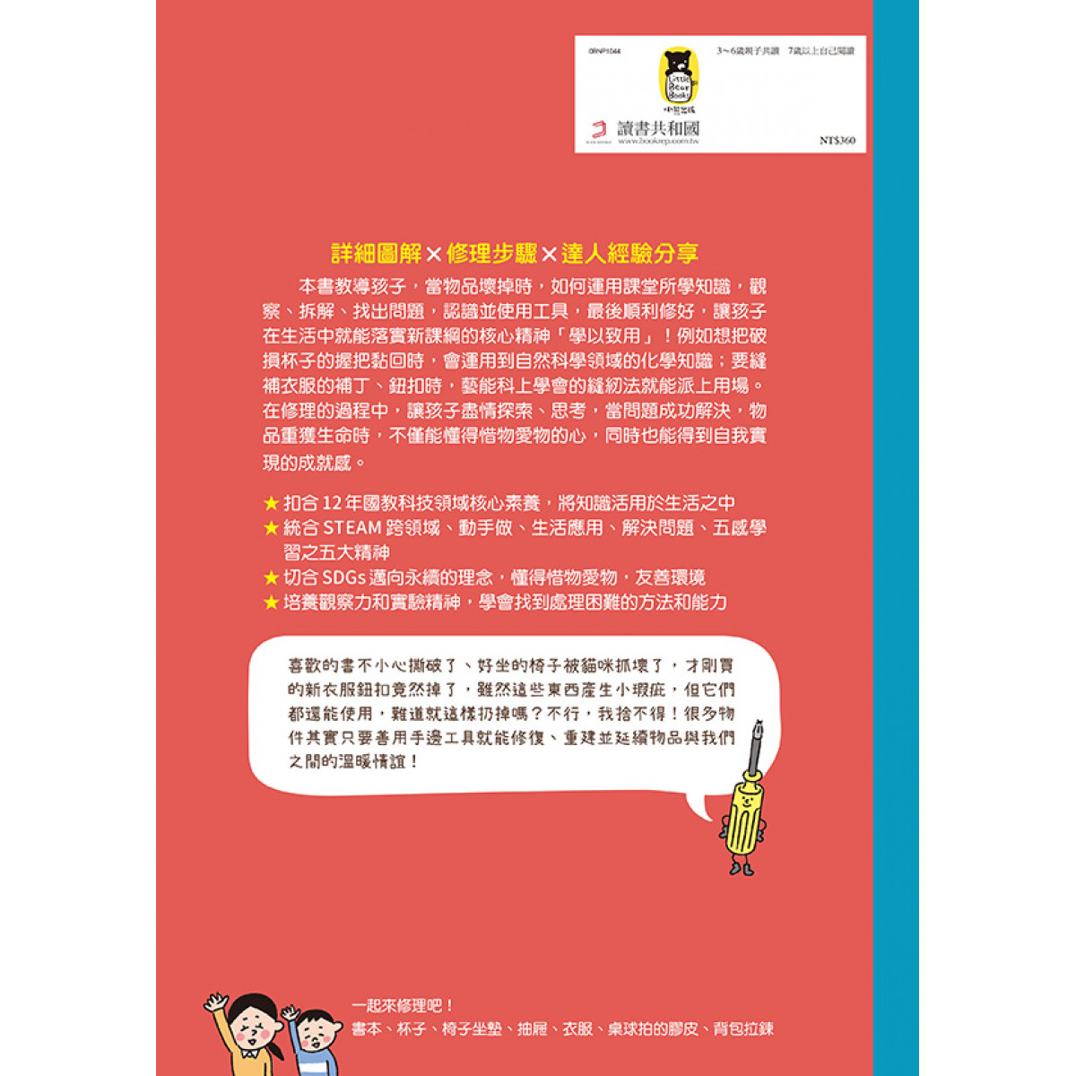 本書為「小學生的STEAM生活實踐場」系列套書(全套3冊)中的第一本《我是小小修理師1.東西壞了怎麼辦?》。物品損壞是常見的意外場景,像是破掉(杯子的握把摔斷)、掉落(桌子抽屜前板掉落)、壞掉(背包的拉鍊拉不上)等,遇到了該怎麼辦呢?本書內容分成兩個部分,第一部分教導孩子自己在家就能做到的修理,先按照書中所教步驟檢查損壞程度,不同的狀態會使用到的工具各不相同,學習準備適合的工具並了解原理和使用方法,接著就是實際動手。在過程中,孩子將會活用課堂所學知識,觀察、拆解、找出問題,讓孩子在生活中就能落實新課綱的核心精神「學以致用」。
