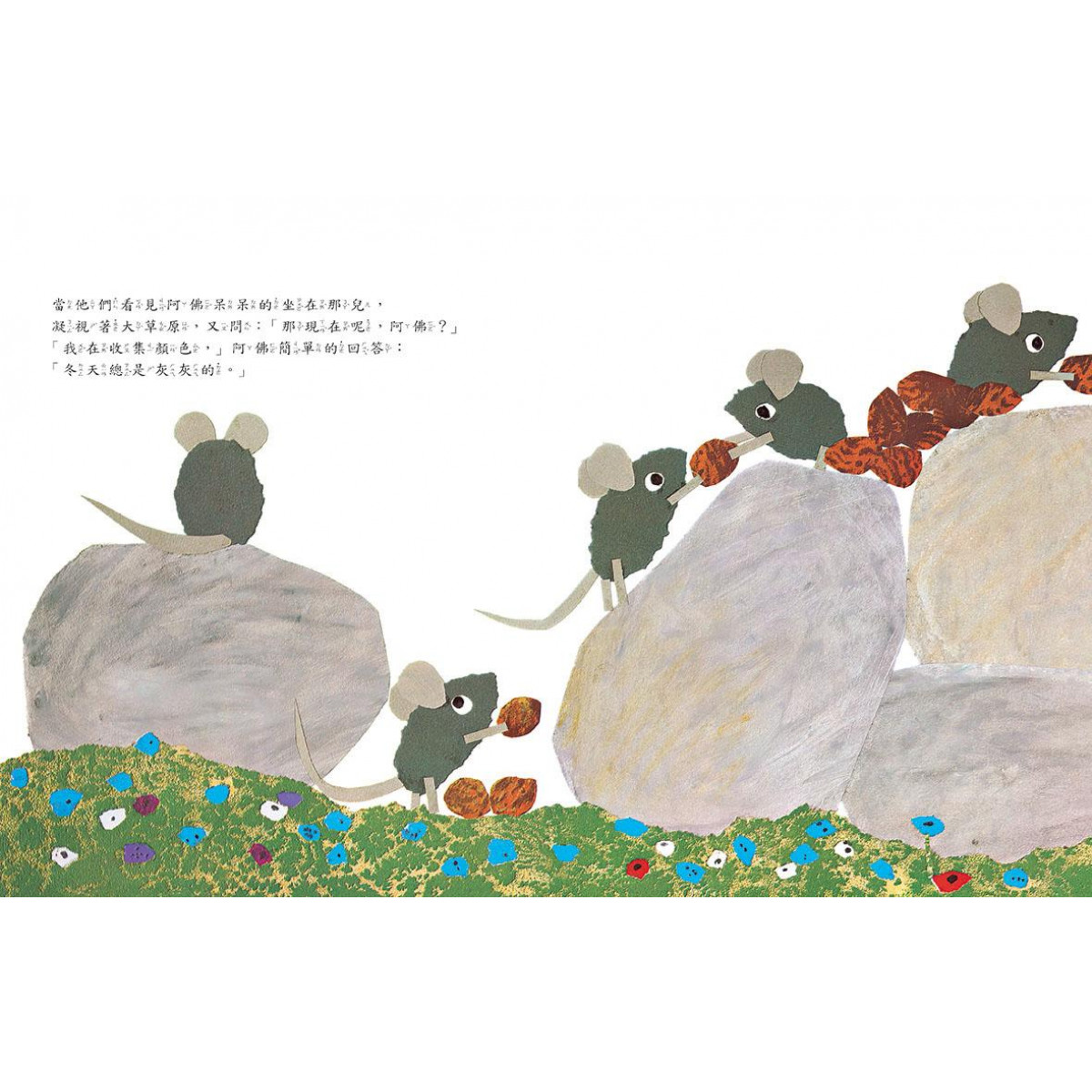 阿佛是一隻田鼠,和他的家人住在一起,當其他的田鼠都忙著為冬天儲糧時,他卻無所事事,還說自己正在收集陽光、顏色和字。冬天來臨,等到儲存的糧食全都吃光了,大家都愁得不想開口。這時,阿佛才把他蒐集的東西,朗讀給大家聽,阿佛說起太陽那金黃色的光芒,大家就覺得溫暖多了,阿佛說到麥田的紅罌粟和樹叢裡的綠葉子,就像把顏色撒在心頭上似的,阿佛的聲音豐富了枯寂的冬日,原來,阿佛是個詩人呀!