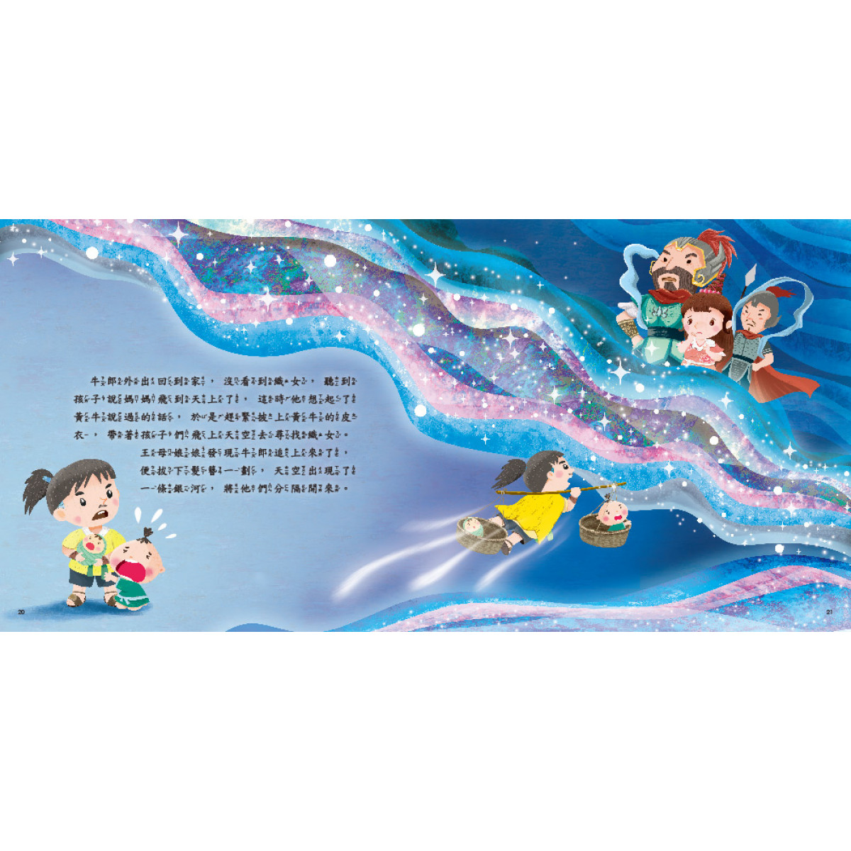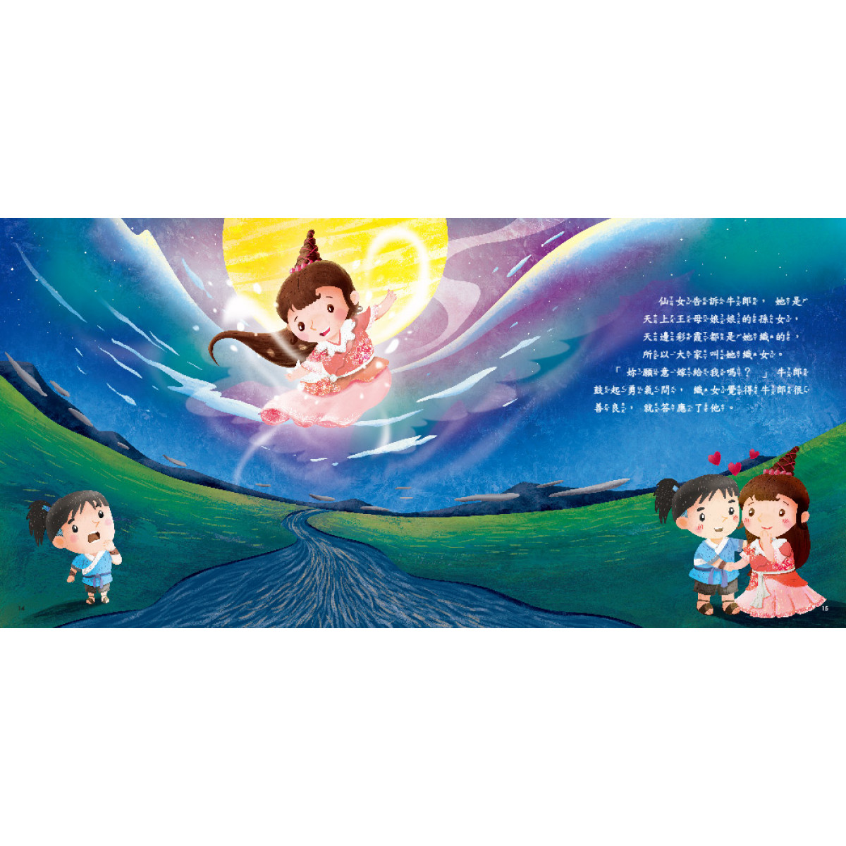1.    以精緻細膩的畫風、生動童趣的構圖,表現「牛郎織女」的傳說故事,內容淺顯,讓孩子輕鬆閱讀、好理解。