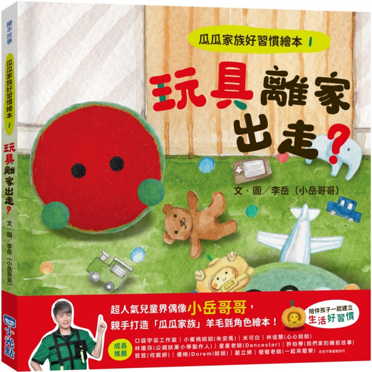 《瓜瓜家族好習慣繪本》作者為小岳哥哥,以親手製作的「瓜瓜家族」羊毛氈造型偶,結合插畫背景,帶入生活習慣的養成內容,巧手打造全系列三冊繪本:《玩具離家出走?》、《手機怪獸來襲!》、《沒禮貌的瓜瓜》,全新獨特的繪本呈現方式,讓孩子跟著瓜瓜家族一起成長,學習生活好習慣。