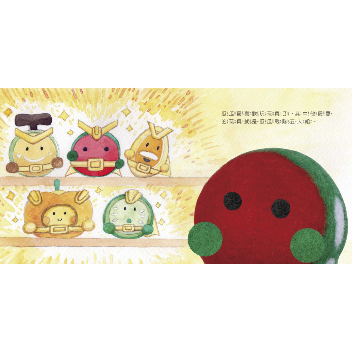 瓜瓜:紅配綠的小西瓜,年紀最小,充滿好奇心,但也因為這樣,有時會做出讓大家傷腦筋的事。