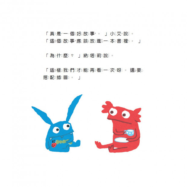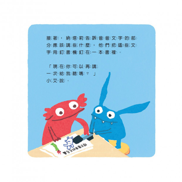 姐弟的創作時間:經過小小的放棄、掙扎,納塔莉本身就是說故事的好手,和小艾一搭一唱,一塗一畫,藉著和家人分享他們的自創故事,走出自己的閱讀新視界。